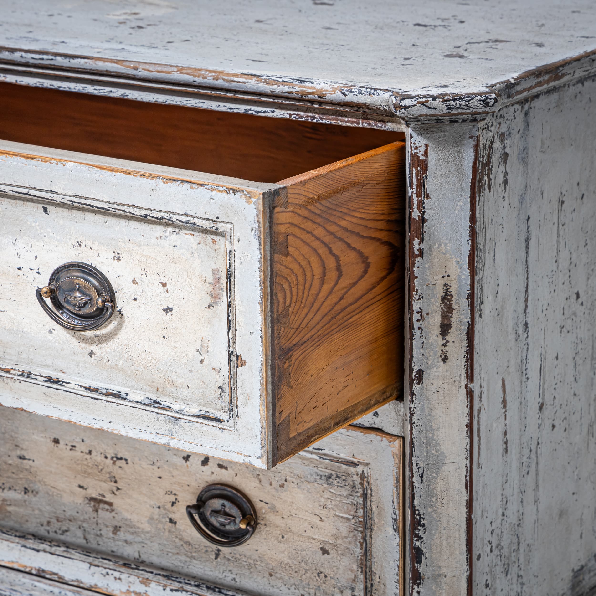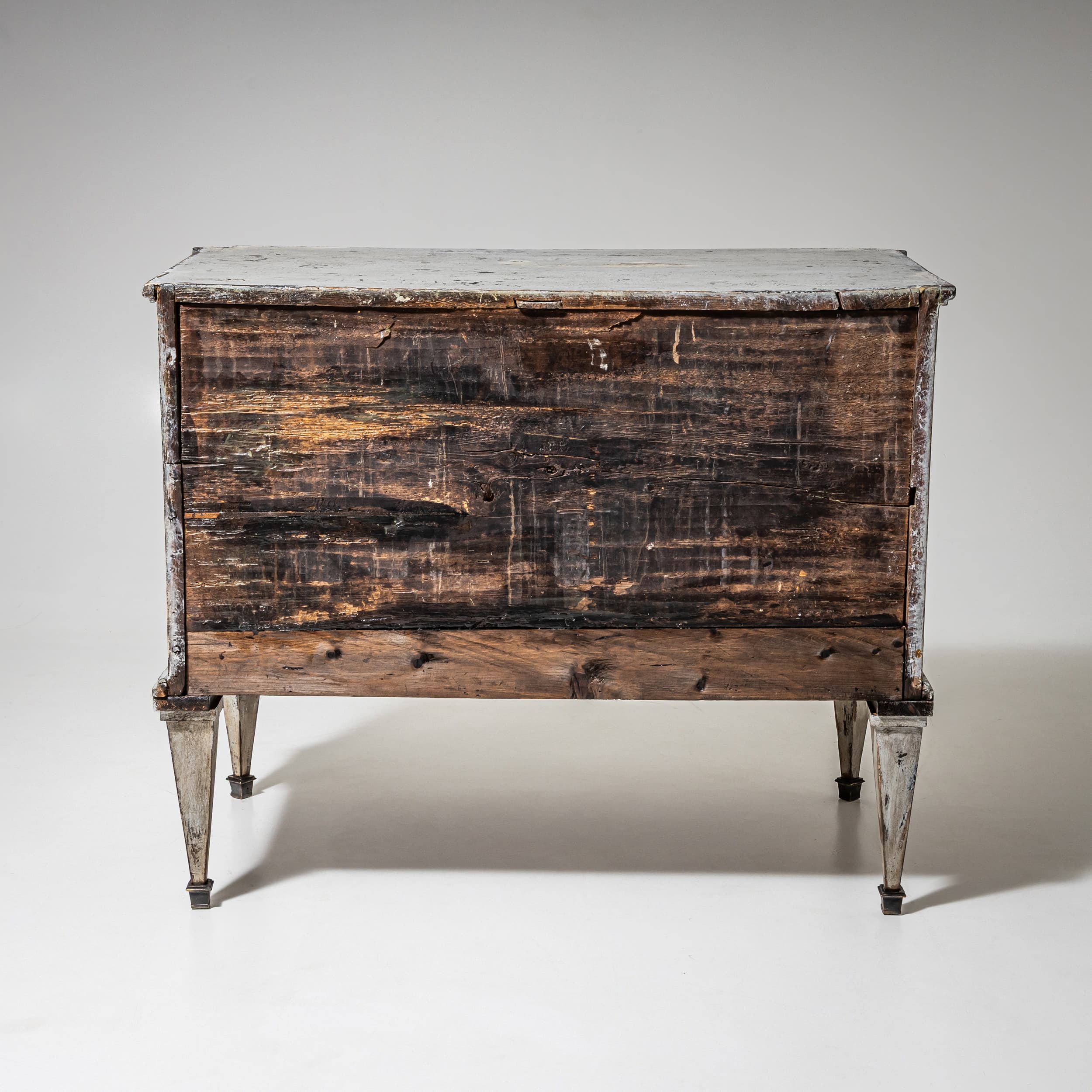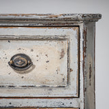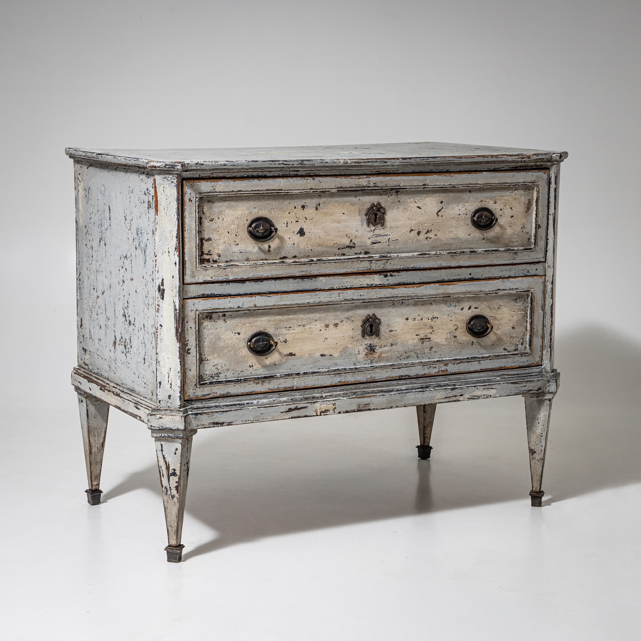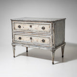 Chest of drawers with two drawers and a straight carcass. The carcass is light-painted. The drawer fronts are framed. The piece stands on tapering feet.