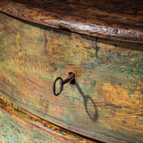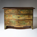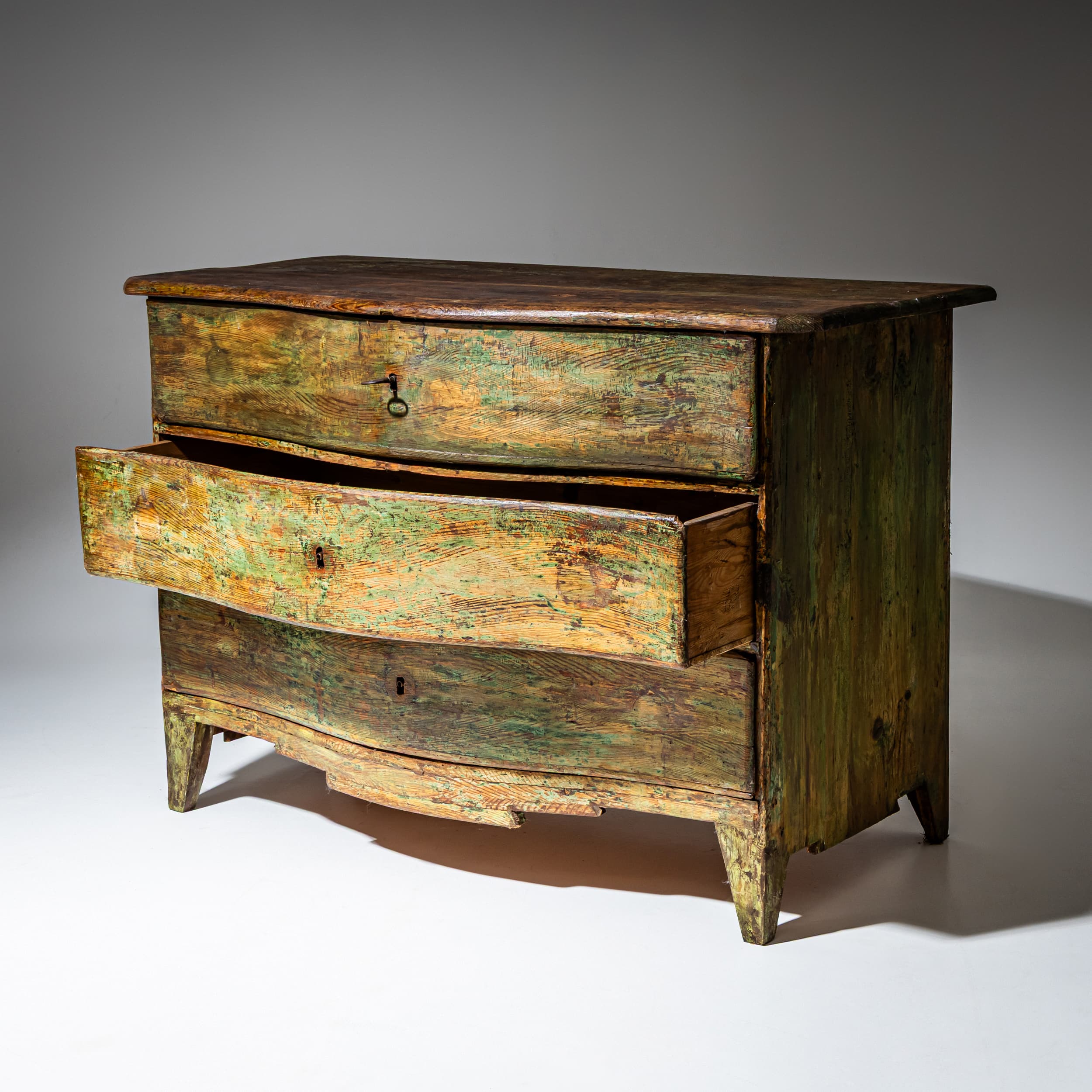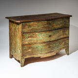 Baroque chest of drawers with a gently serpentine front and three drawers. The chest stands on tapering legs and is finished in a green-painted surface with a deliberately washed and aged appearance. It displays a wonderful, character-rich patina, giving the piece an authentic presence and strong decorative appeal.