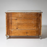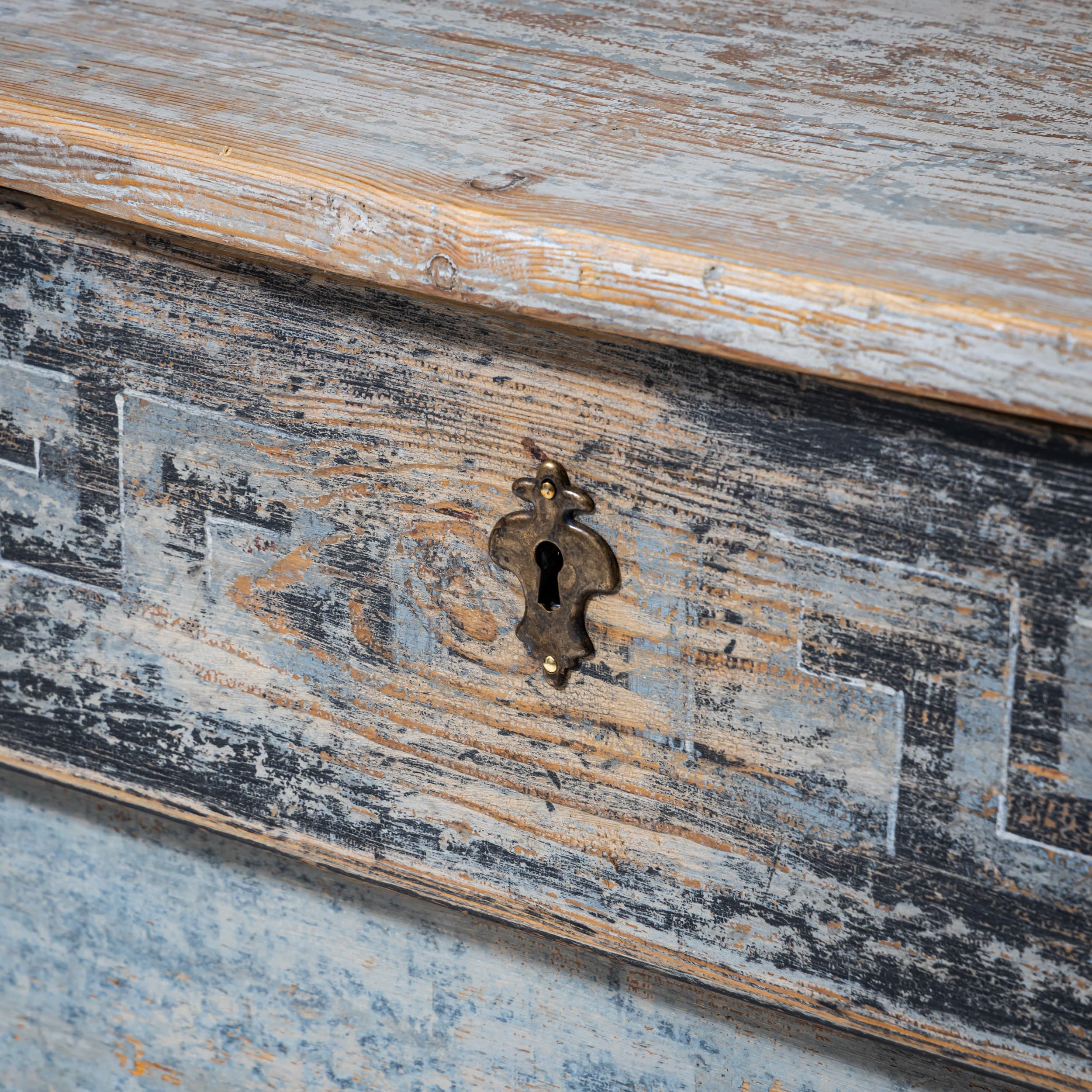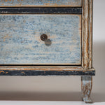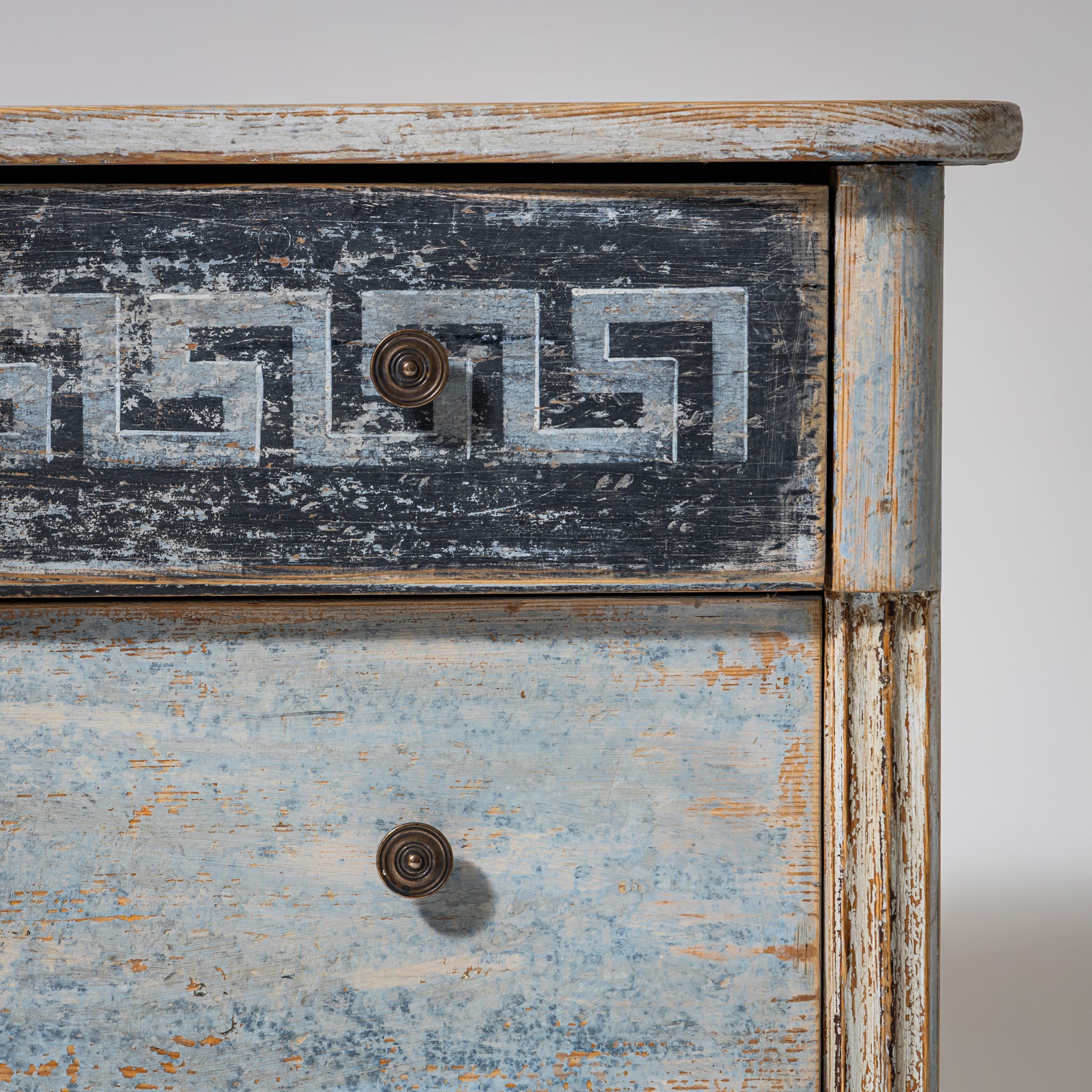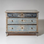 Light blue painted Biedermeier commode with three drawers and gracefully curved legs. The newly applied finish features a meander-band décor and has been antiqued to evoke an authentic historic appearance.