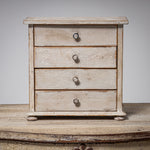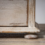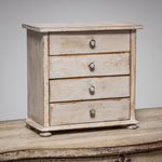 Small commode with four drawers and small knobs. Newly painted in light grey and given an antique patina.
