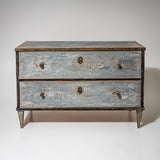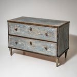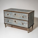 Blue-painted Neoclassical chest of drawers with a rectilinear case raised on tapering square legs. The piece features two drawers fitted with small round knobs and understated hardware.