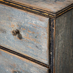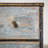 The light blue painted finish with darker contrasting edges has been newly applied and decoratively distressed to achieve an authentic aged appearance.