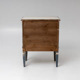 New Pair of Commodes in the Louis XVI Style with Hand-Painted Historicist Decoration. This newly crafted pair of rectangular commodes stands on tapered legs and features two drawers each. The drawer fronts are adorned with centrally placed classical motifs painted in grisaille style. The surface finish is deliberately aged, in white and blue tones, evoking the charm of antique patina.