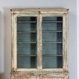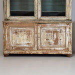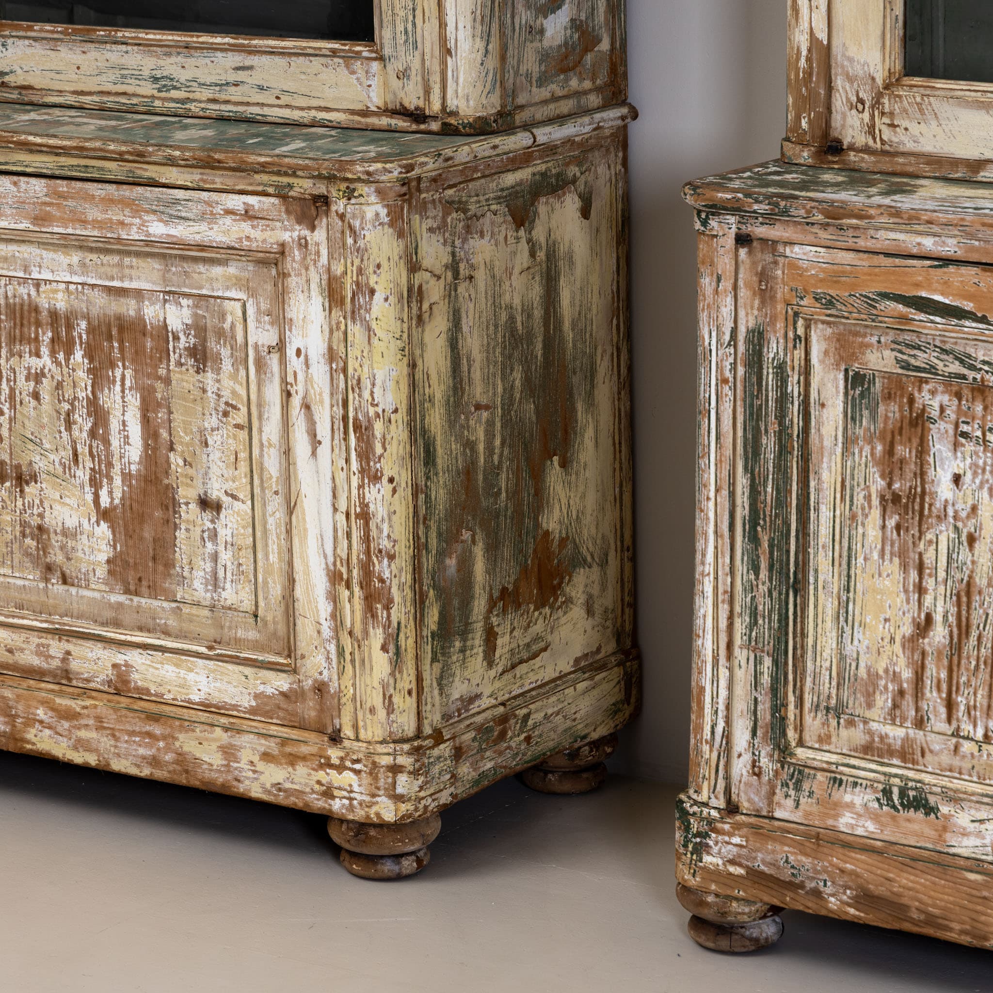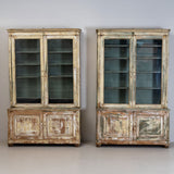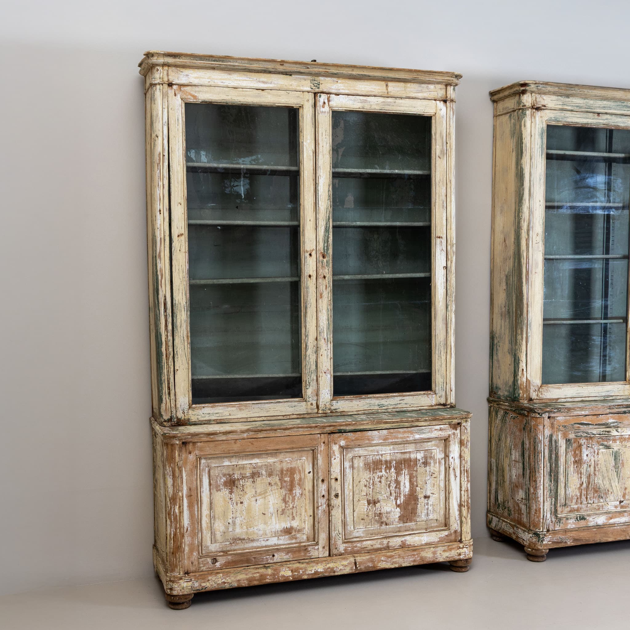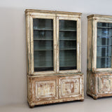 Pair of substantial bookcases with two-door lower sections and glazed two-door uppers fitted with adjustable shelves. The old, partially divided glass panes add to their antique appeal. The new cream-colored finish with artificial patina is executed in a vintage shabby-chic style, giving the pieces an elegant, time-worn character.