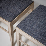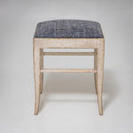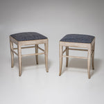 Pair of painted stools with splayed tapered legs and a simple stretcher. Newly upholstered in grey fabric and repainted in cream white with an antique patina.