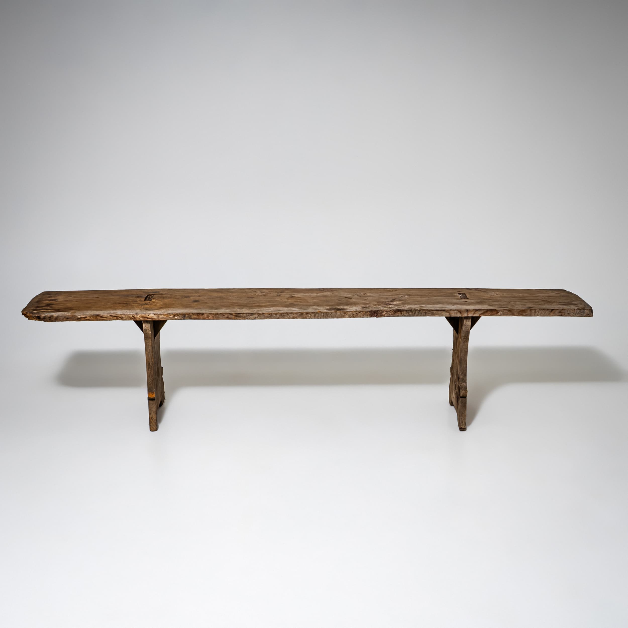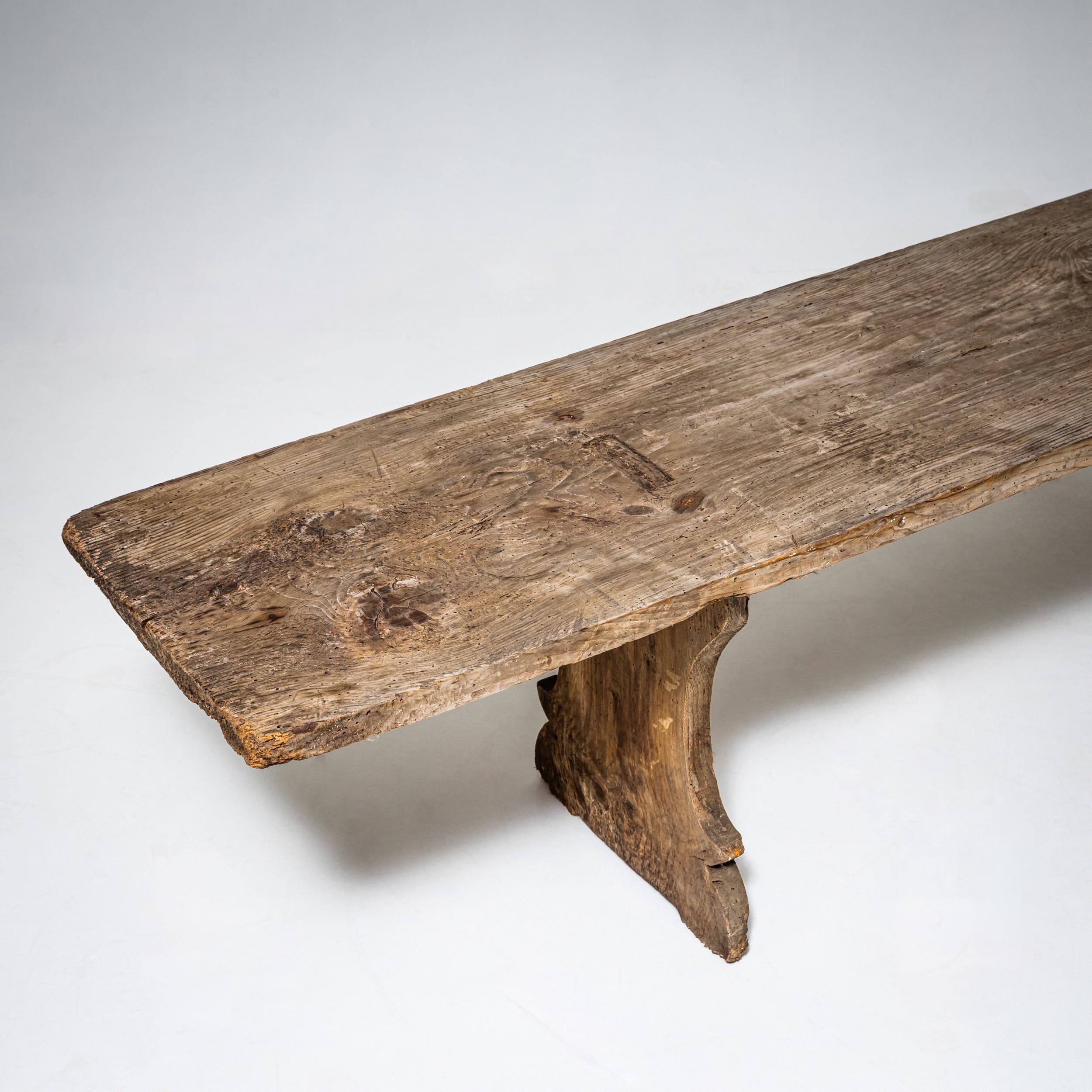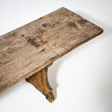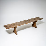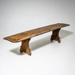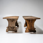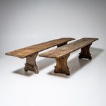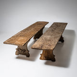 Pair of rustic spruce wood benches from Northern Italy, dating to the first half of the 19th century. Each bench features a seat formed from a single continuous plank, supported by shaped side panels with softly contoured cutouts. Authentic rural seating with a strong character.