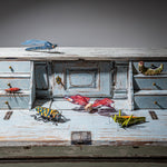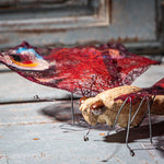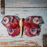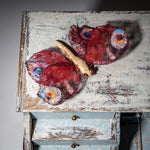 Sculptural butterfly made of ceramic and wire, handcrafted in Europe, 2025. The wide-spread wings, executed in richly colored translucent material, give the piece a striking visual presence. The glazed ceramic body is supported by delicate wire legs. A poetic, almost dreamlike object with strong decorative appeal, perfect as a focal point in any interior.