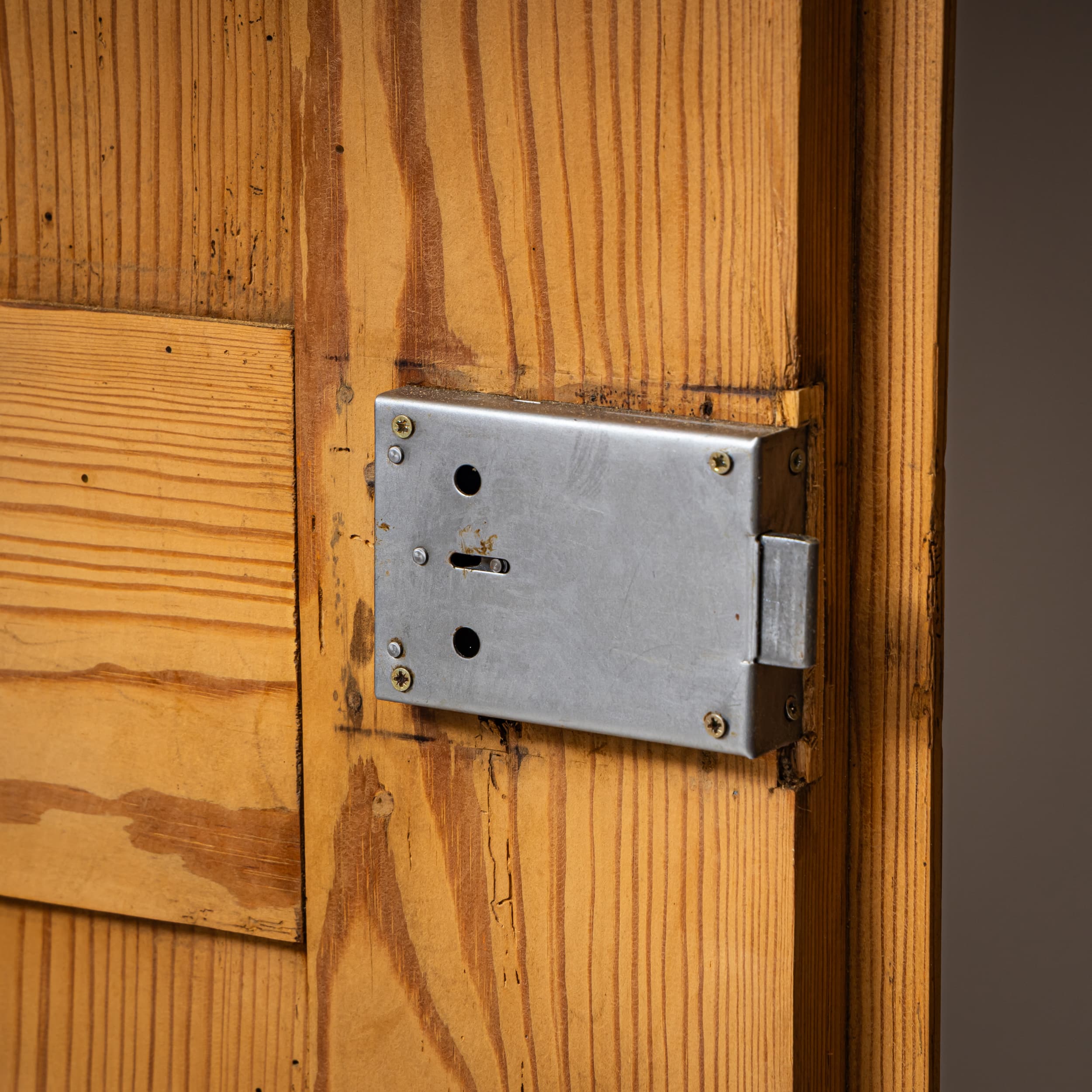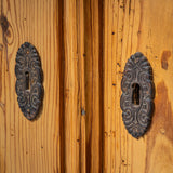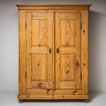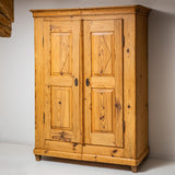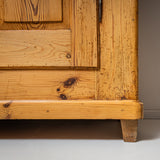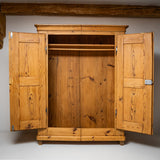 Two-door rustic armoire made of fir wood, featuring iron hardware and four panelled door sections. The piece is topped with a flat cornice with a simple cavetto molding. The interior includes a hat shelf and a clothes rail, making it suitable for use as a wardrobe.
