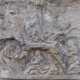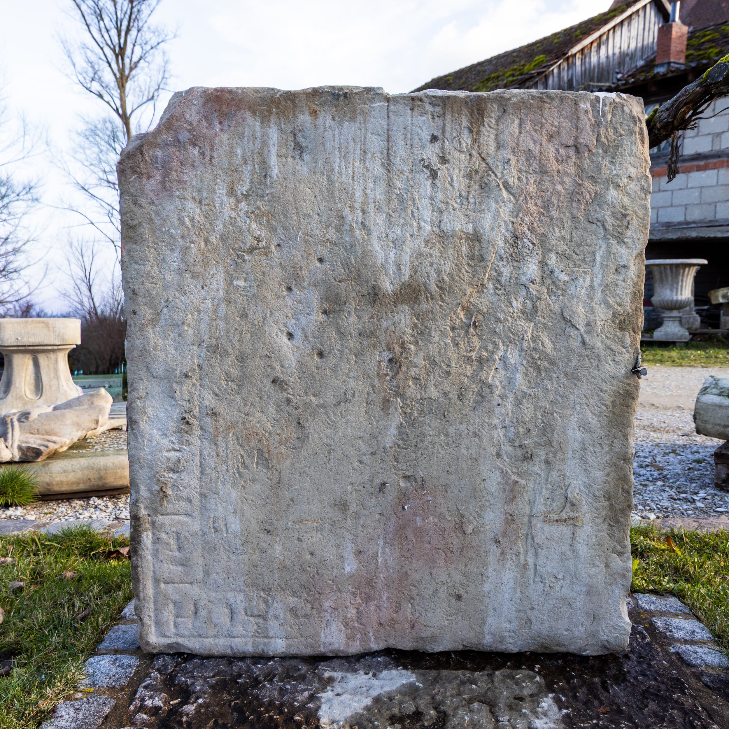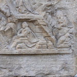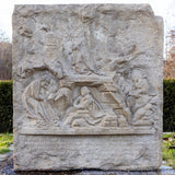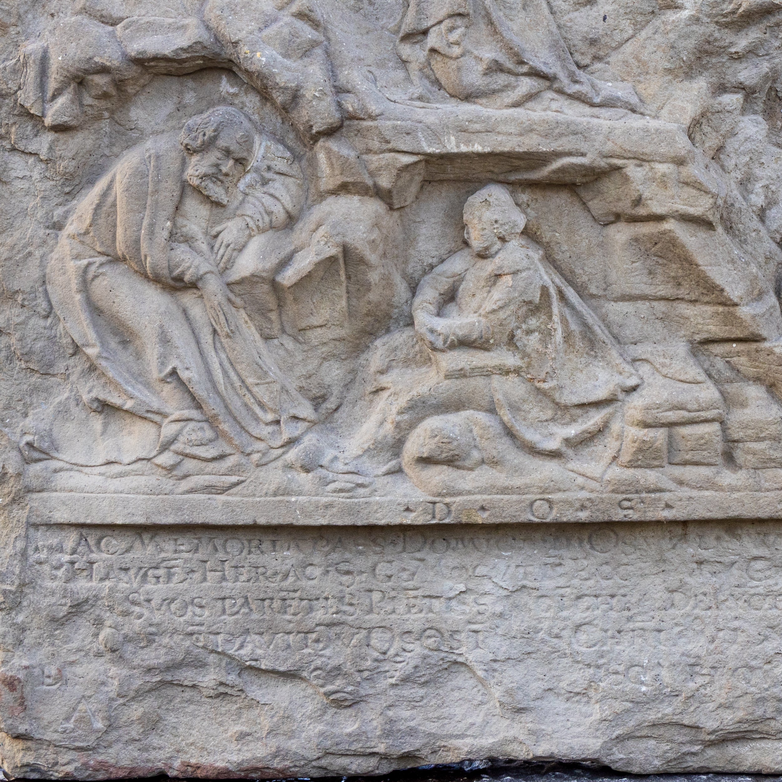 Franconian sandstone epitaph with a relief-carved figural scene. The inscription is heavily weathered and no longer legible.