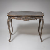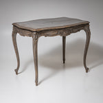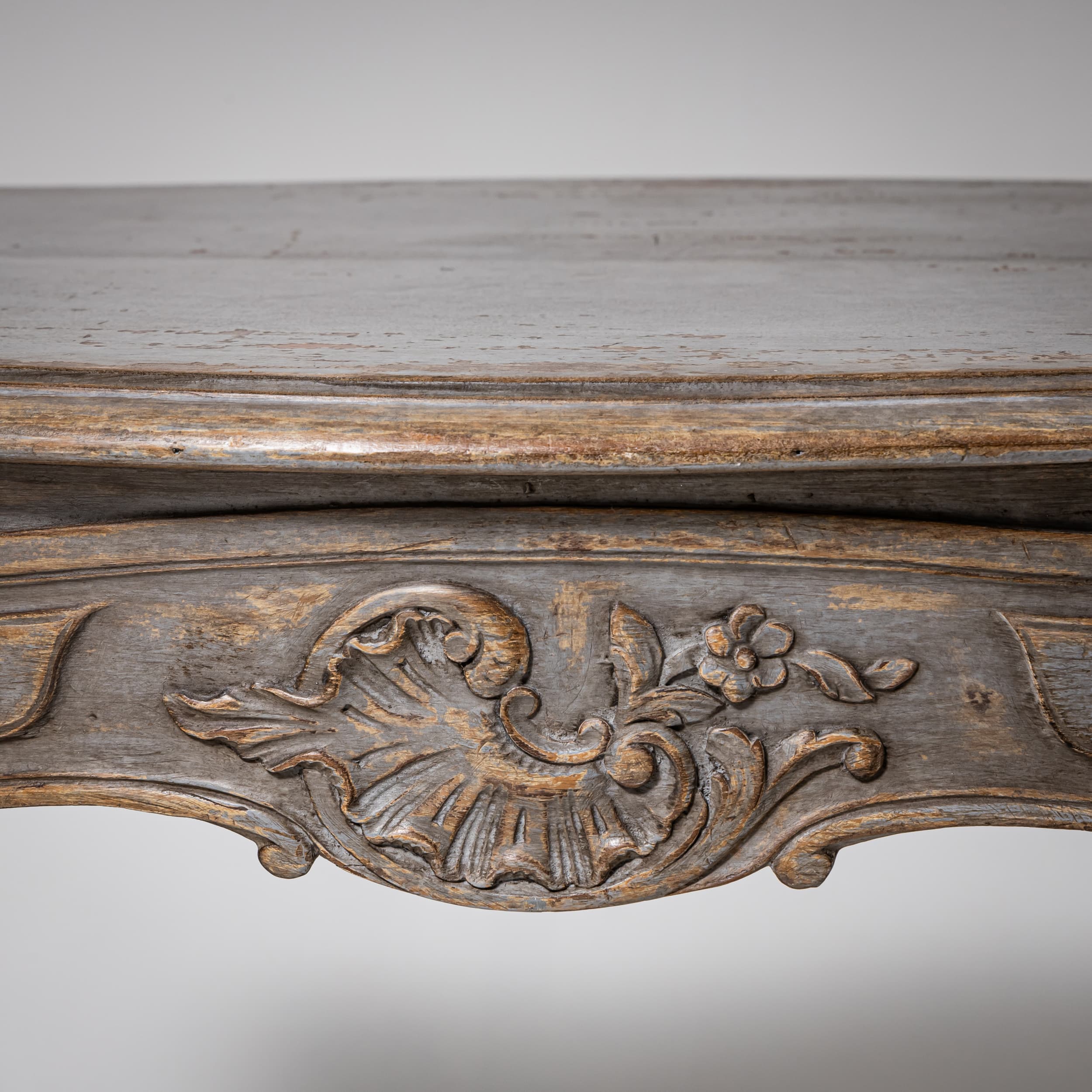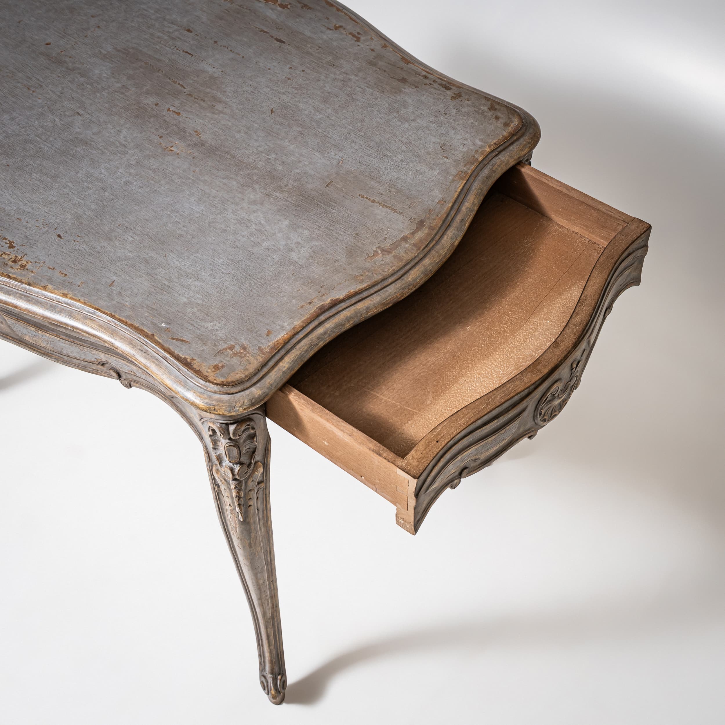 Painted table in Rococo style with cabriole legs and a shaped apron carved with shell and rocaille motifs. Newly painted in grey and given an antique patina. A drawer is integrated on the side.