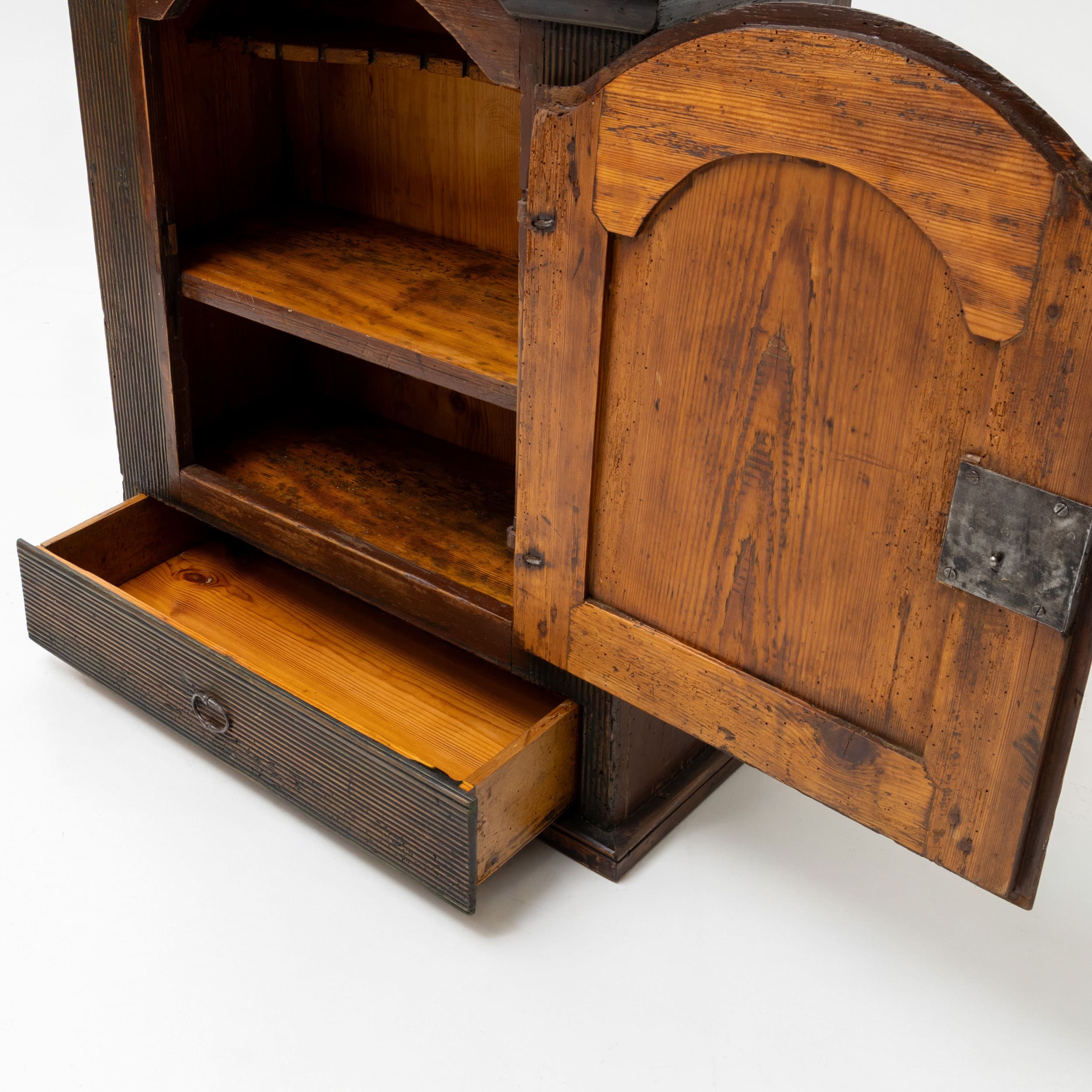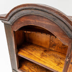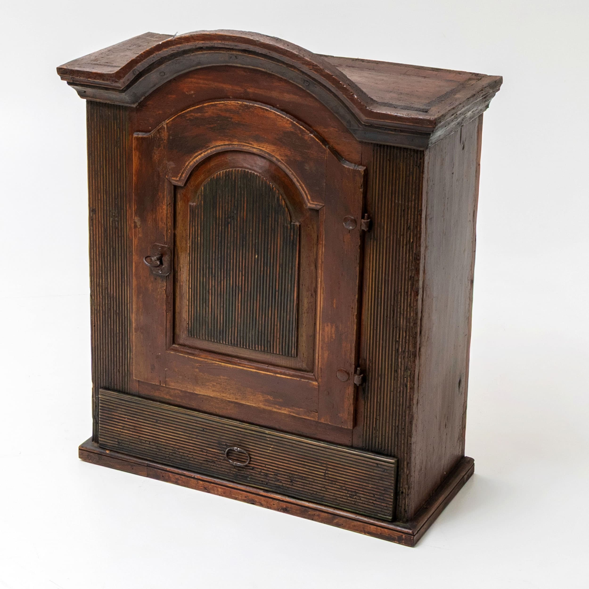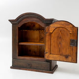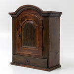 A rustic softwood hanging cupboard with a dark finish. The piece features a curved, arched top and fluted side panels. The central door with its arched panel opens to a functional interior, complemented by an additional drawer in the base for extra storage.