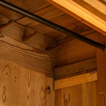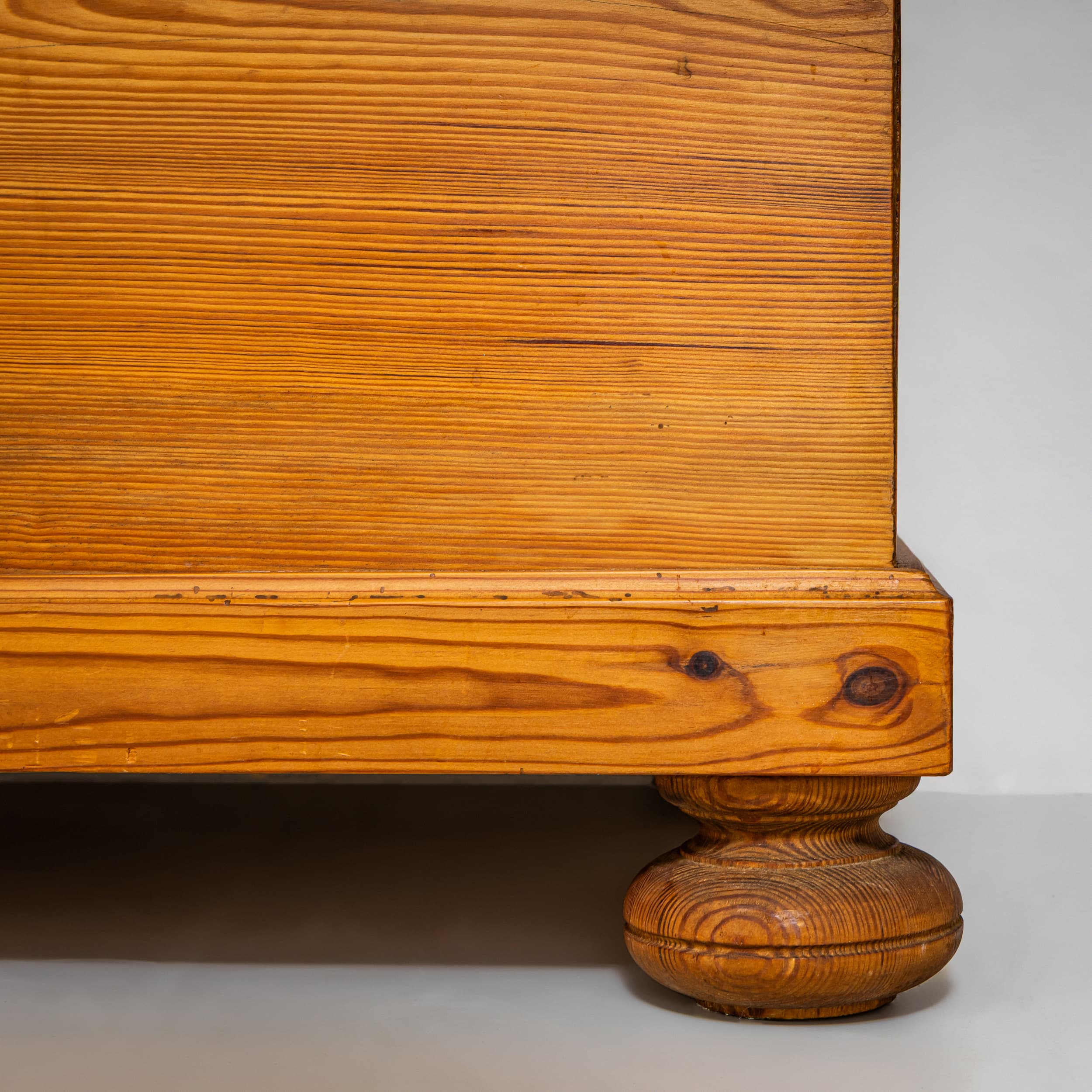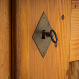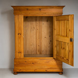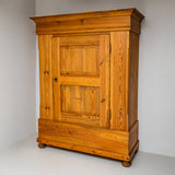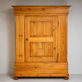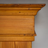Single-door softwood wardrobe featuring a diamond-shaped brass escutcheon and compressed bun feet. The clean, rectilinear body is topped with a flat molded cornice. The interior is fitted with a clothes rail.