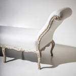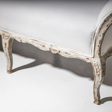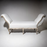 Large upholstered settee or bench in Baroque style, featuring volute-shaped side rests and an elegantly curved wooden base. The frame has been newly painted in cream white and given an antique patina. The piece has been newly upholstered and covered in a white fabric.